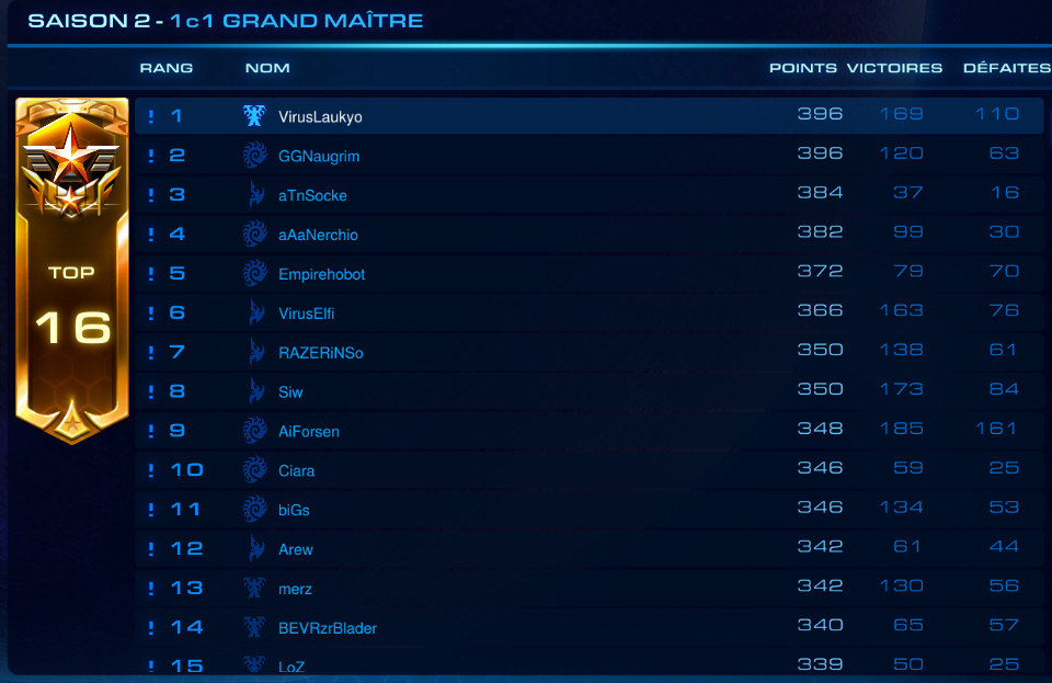 Cocorico puisque c'est Laukyo qui occupe la première place pour le moment ;) Vous pouvez consulter le classement entier sur Bnet dans la section "Ligues et classements" / "Grand Maître".
