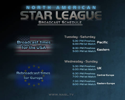 La North American Star League, ou NASL, vient de débuter hier. Ce tournoi américain, mais ouvert à des joueurs venant de partout, a pour ambition de rivaliser avec la GSL avec une grosse organisation et beaucoup d'argent ($100.000 pour la première saison). Et on a donc pu assister aux premier matchs avec par exemple les victoires de TLO, Fenix, Moon et Morrow. Les matchs vont s'enchainer très rapidement puisqu'il y a plusieurs matchs par jour ! Toutes les informations se trouvent sur le site officiel NASL comme le planning des matchs ou encore les résultats. Pour le stream officiel c'est ici : http://www.justin.tv/naslseasonone A noter que la NASL n'oublie pas les spectacteurs européens car il y a une rediffusion en fin d'après-midi (cf l'image ci-dessous). La chaine de stream proposera aussi toutes les VODS visiblement.